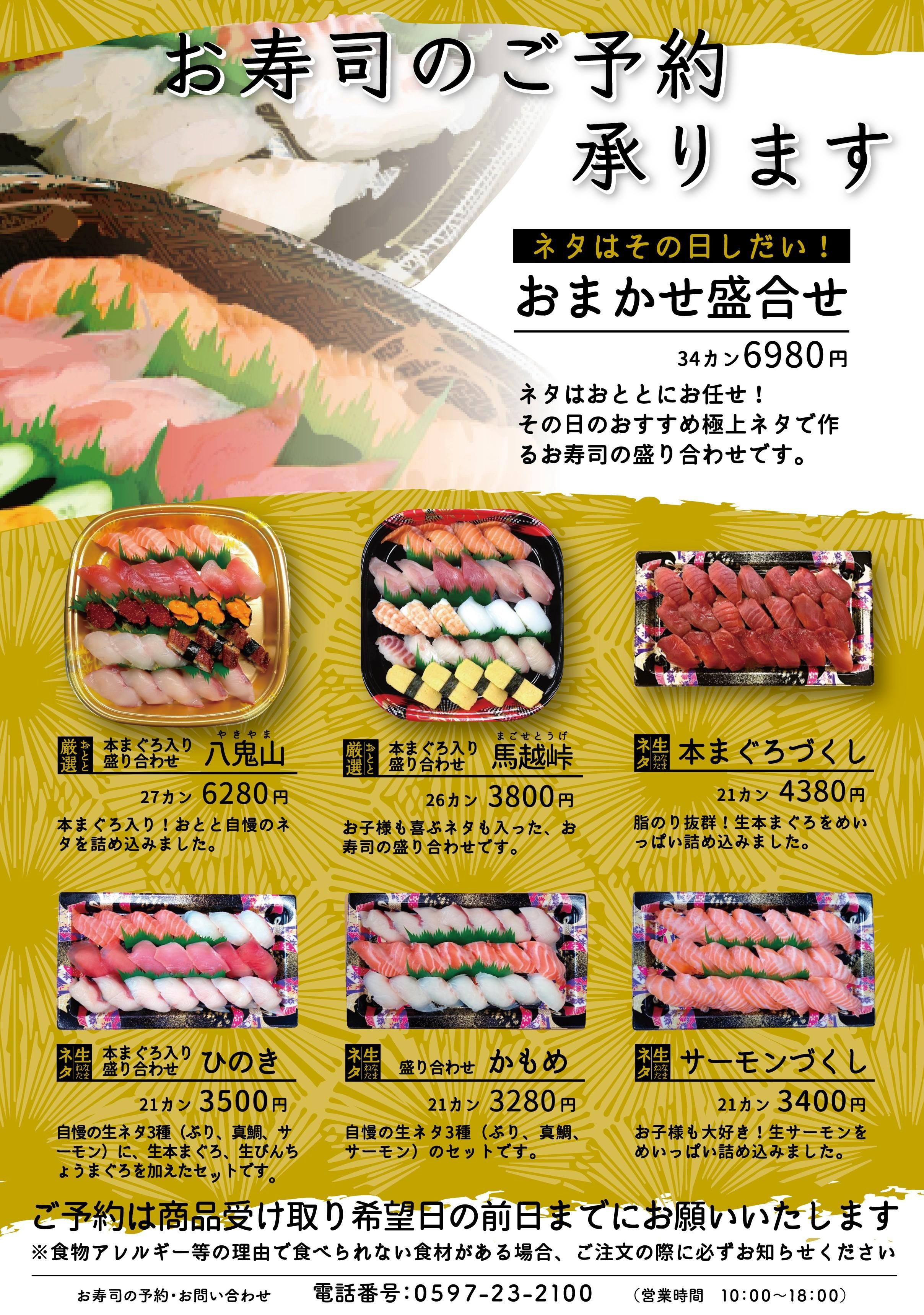 年中無休。年末年始も休まず営業しています。 みんなが集まる食卓に、おととのお寿司はいかがですか? お問い合わせは、おとと店舗内「おわせ魚食堂」スタッフまでお声がけください! お電話でも受け付けています。電話番号:0597−23−2100 ※仕入れの状況などにより、内容が変更となる場合もございます。ご了承くださいませ。 |